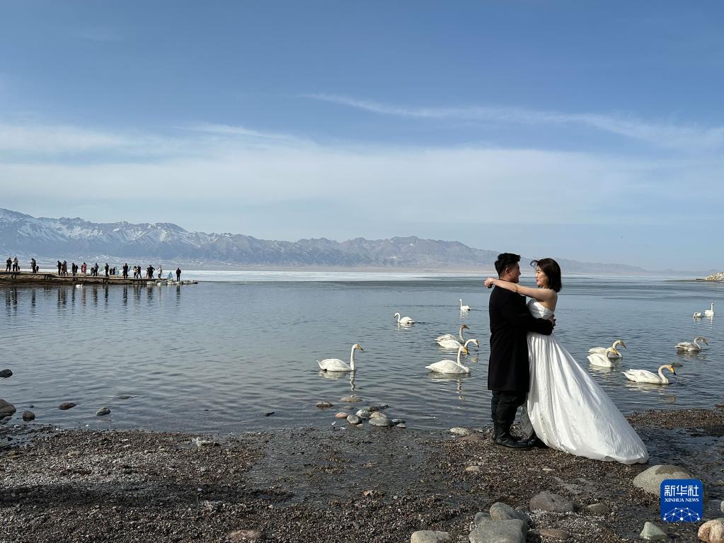 4月6日,一對情侶在賽里木湖畔拍攝婚紗照。