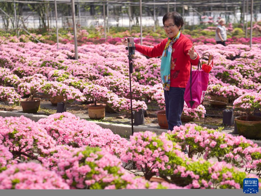 4月8日,嘉善縣82歲的抖音愛(ài)好者胡品文在大云鎮碧云花園直播杜鵑花。
