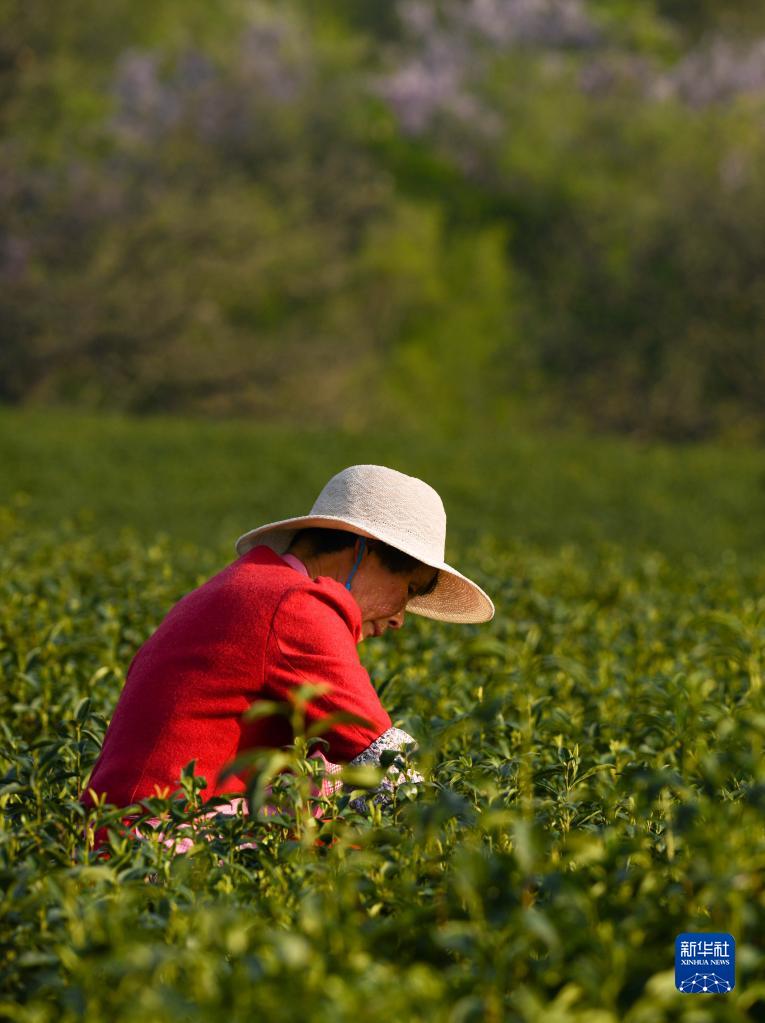 4月8日,采茶工在敬亭山山腳下的一處茶園里采茶。