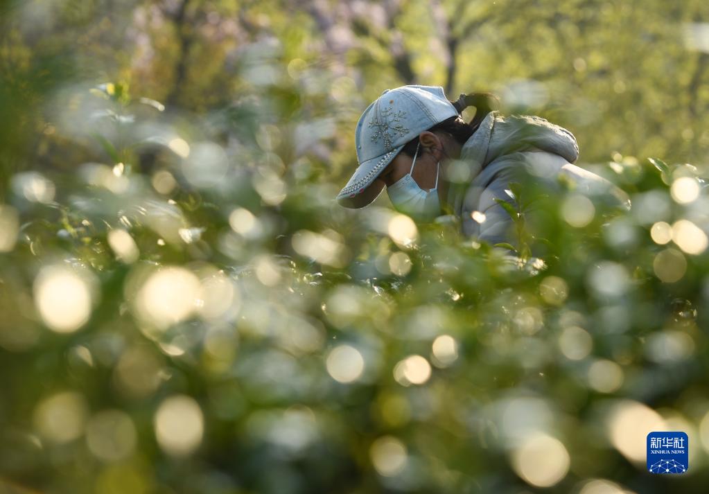 4月8日,采茶工在敬亭山山腳下的一處茶園里采摘茶葉。