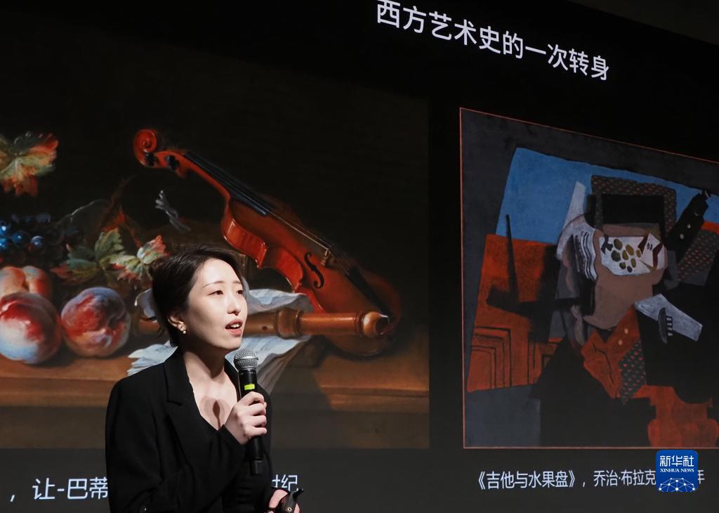 4月8日,上海西岸美術(shù)館導覽員康恬在徐家匯書(shū)院為市民導覽西方藝術(shù)展覽作品。