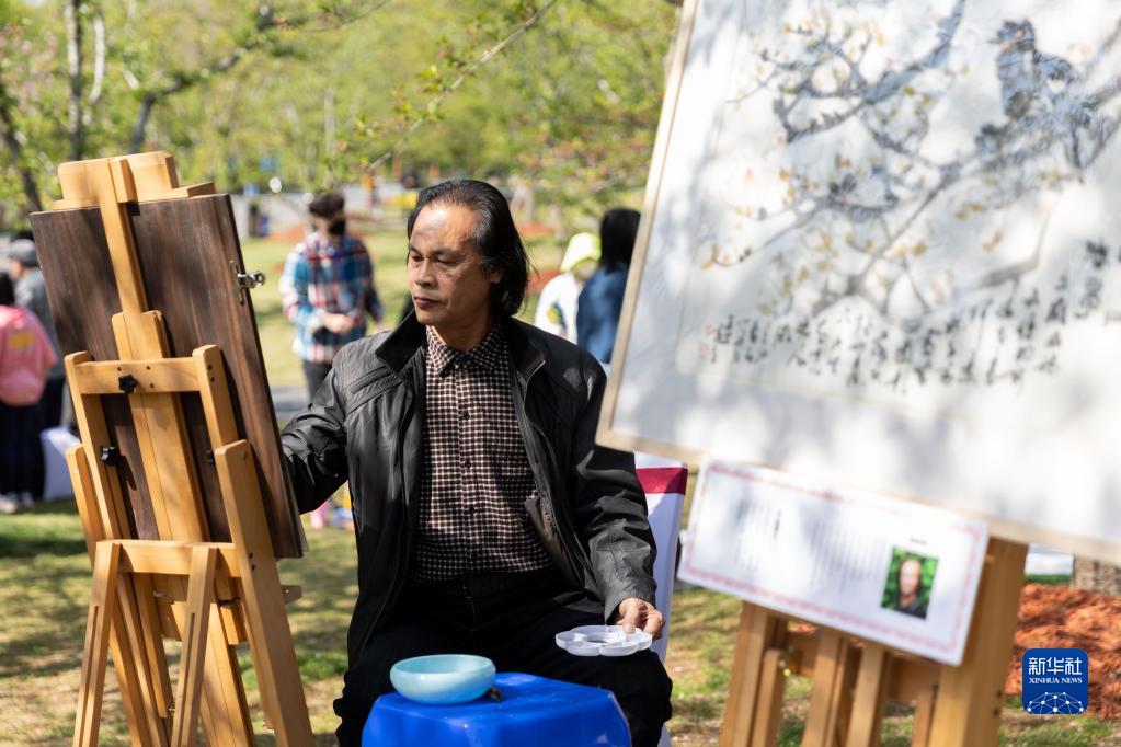 4月8日,書(shū)畫(huà)家在上海市寶山區顧村公園“櫻畫(huà)書(shū)藝”主題展覽上創(chuàng )作。