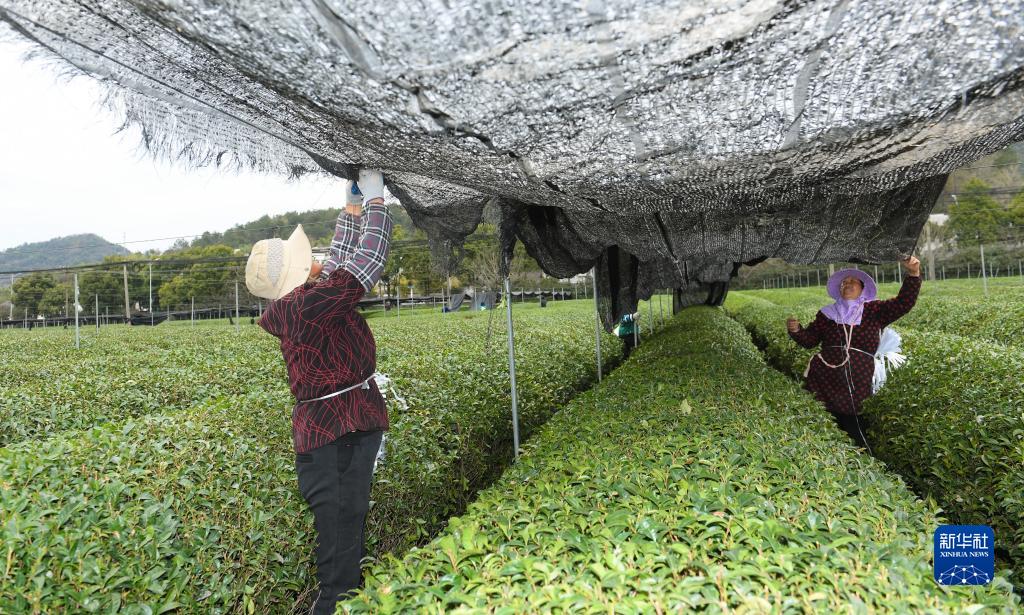 在浙江省紹興市越城區富盛鎮抹茶生產(chǎn)基地,農戶(hù)為茶樹(shù)拉遮陽(yáng)網(wǎng)(2月28日攝)。當地通過(guò)引入抹茶生產(chǎn)技術(shù)發(fā)展抹茶產(chǎn)業(yè),目前成為國內較大的抹茶原料供應基地。