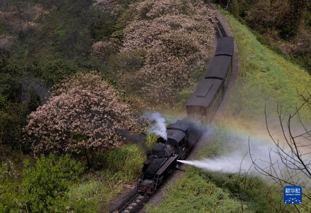 4月9日,一列嘉陽(yáng)小火車(chē)經(jīng)過(guò)亮水沱站的桐子花叢,噴出的蒸汽形成一道彩虹。