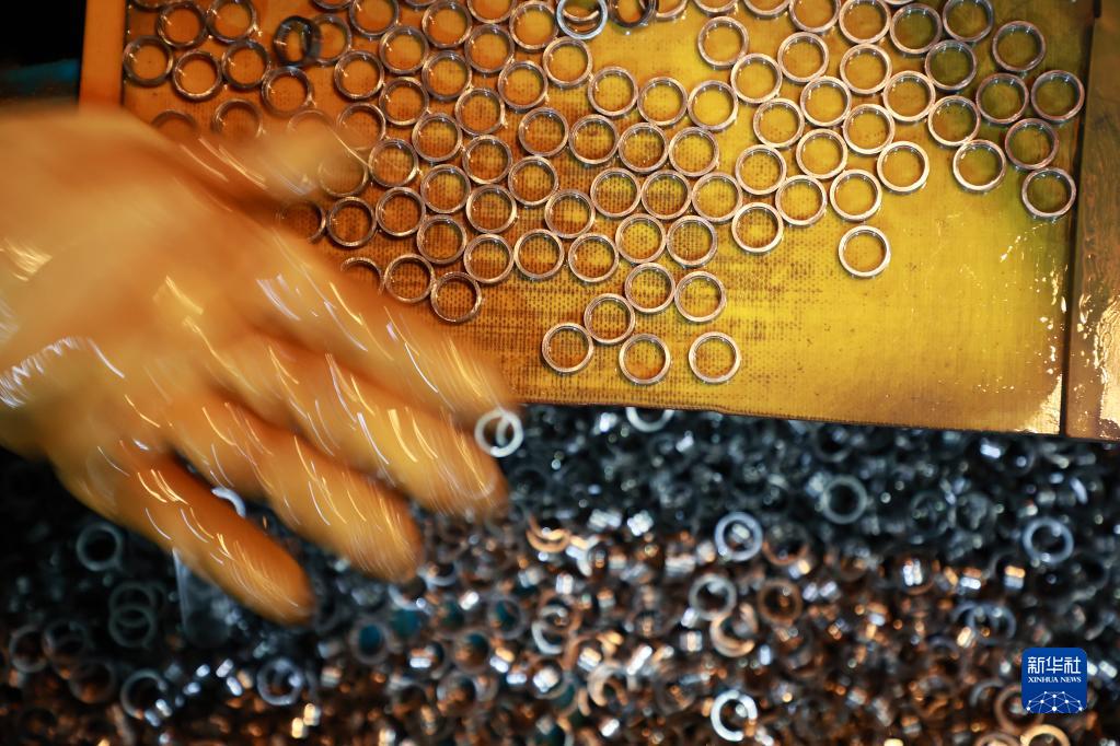 4月10日,搬遷群眾在獨山縣望城社區安置點(diǎn)附近的軸承產(chǎn)業(yè)園區內給軸承涂抹潤滑油。