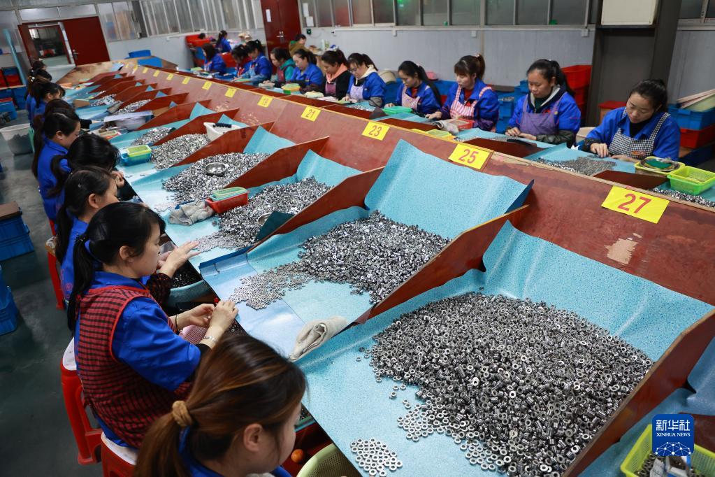 4月10日,搬遷群眾在獨山縣望城社區安置點(diǎn)附近的軸承產(chǎn)業(yè)園區內檢查成品軸承質(zhì)量。