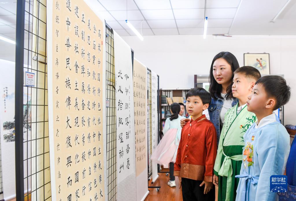 4月10日,在天津小學(xué),學(xué)生們在老師的帶領(lǐng)下參觀(guān)書(shū)畫(huà)展覽。