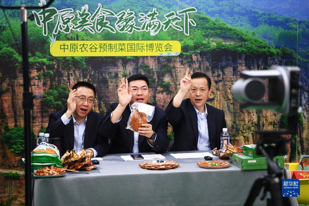 4月10日,參展商在中原農谷預制菜國際博覽會(huì )上通過(guò)直播銷(xiāo)售商品。