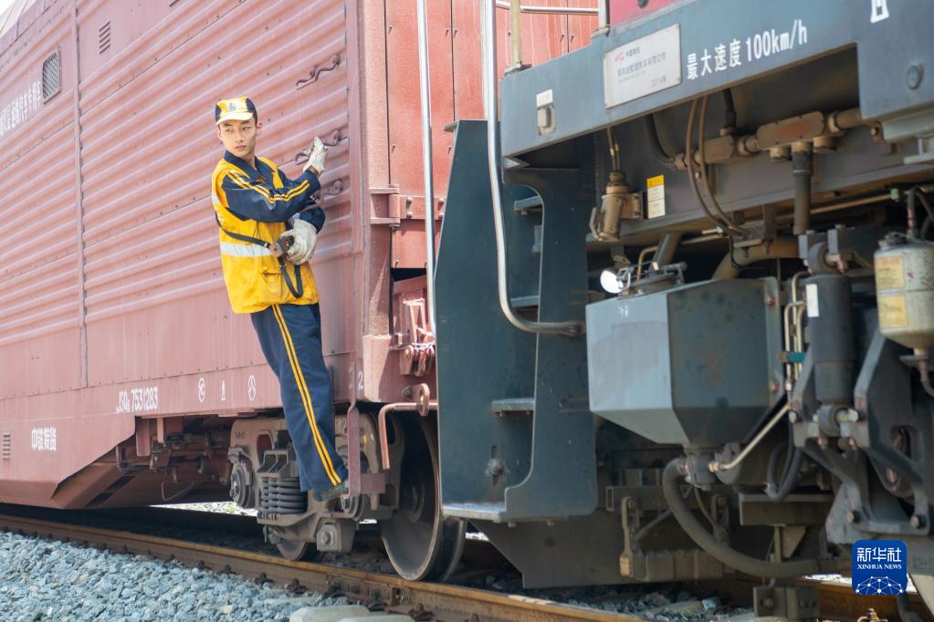 4月10日,在重慶魚(yú)嘴站,工作人員在采用JSQ型車(chē)(專(zhuān)門(mén)運輸汽車(chē)整車(chē)的鐵路貨物車(chē)輛)的中歐班列上作業(yè)。