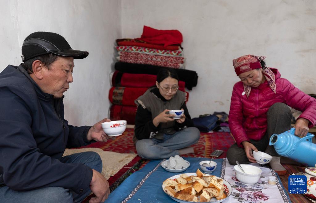4月10日清晨,在阿合奇村,阿不都別克(左)和妻子女兒一起吃早餐。