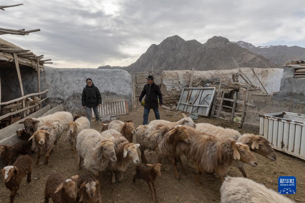 4月10日清晨,在阿合奇村,阿不都別克(右)和女兒一起把羊趕進(jìn)羊圈。
