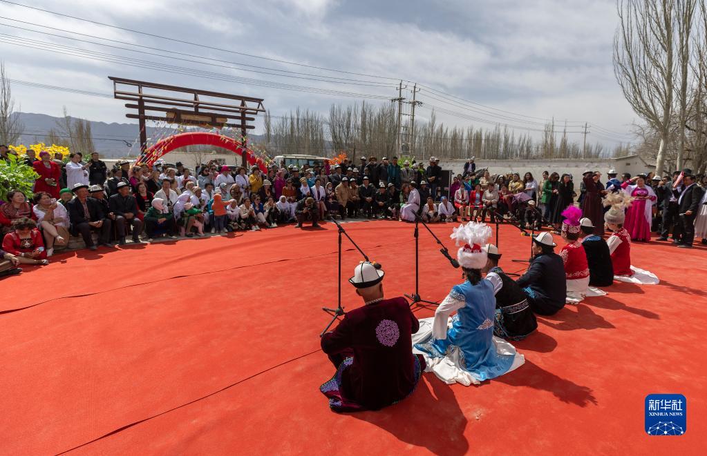 4月10日,在別迭里村,觀(guān)眾在觀(guān)看阿不都別克(前排左四)和同伴的表演。
