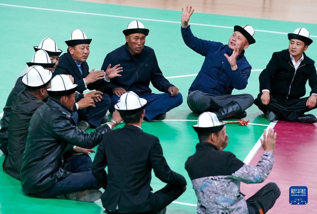4月10日,在阿合奇縣科技文化體育中心,《瑪納斯》傳承人在進(jìn)行排練。