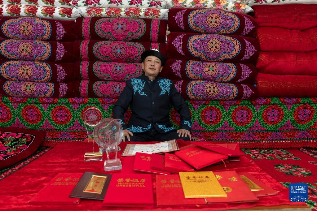 4月10日,在阿合奇村,阿不都別克展示自己獲得的《瑪納斯》演唱比賽獲獎證書(shū)和獎杯。