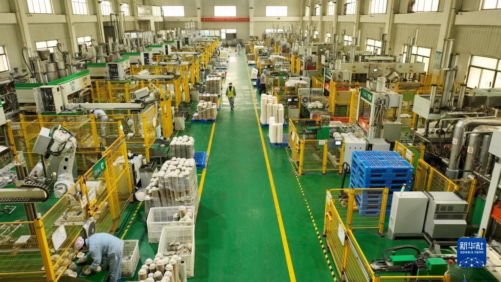 4月11日,在位于山東省滕州市西崗鎮的一家企業(yè),工人生產(chǎn)以秸稈為原料的可降解餐盤(pán)(無(wú)人機照片)。