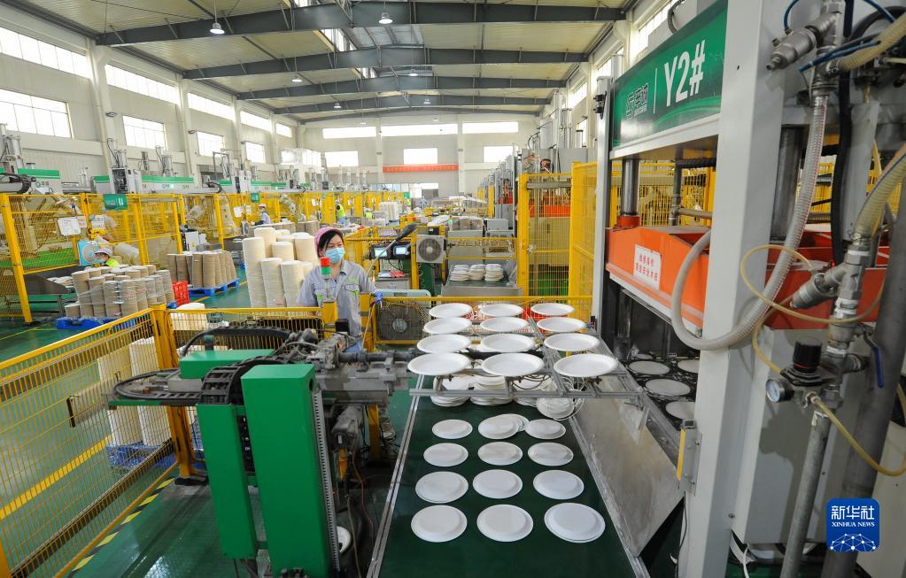 4月11日,在位于山東省滕州市西崗鎮的一家企業(yè),工人操作設備生產(chǎn)以秸稈為原料的可降解餐盤(pán)。