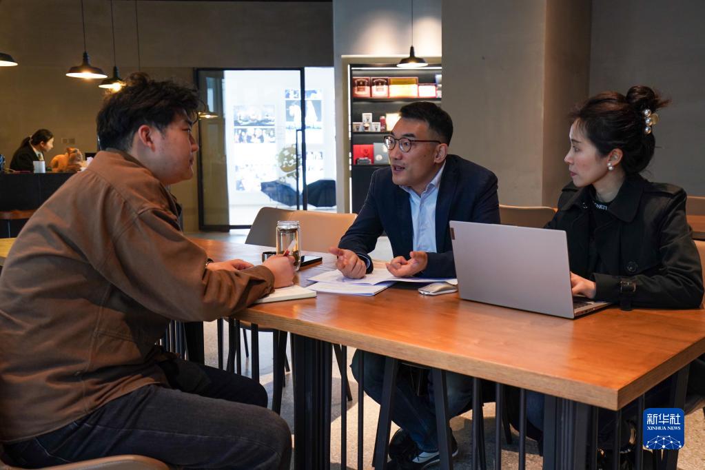 4月6日,彭銳(中)和團隊成員在樹(shù)山村里開(kāi)會(huì ),策劃樹(shù)山村即將舉行的活動(dòng)。 新華社記者 李博 攝