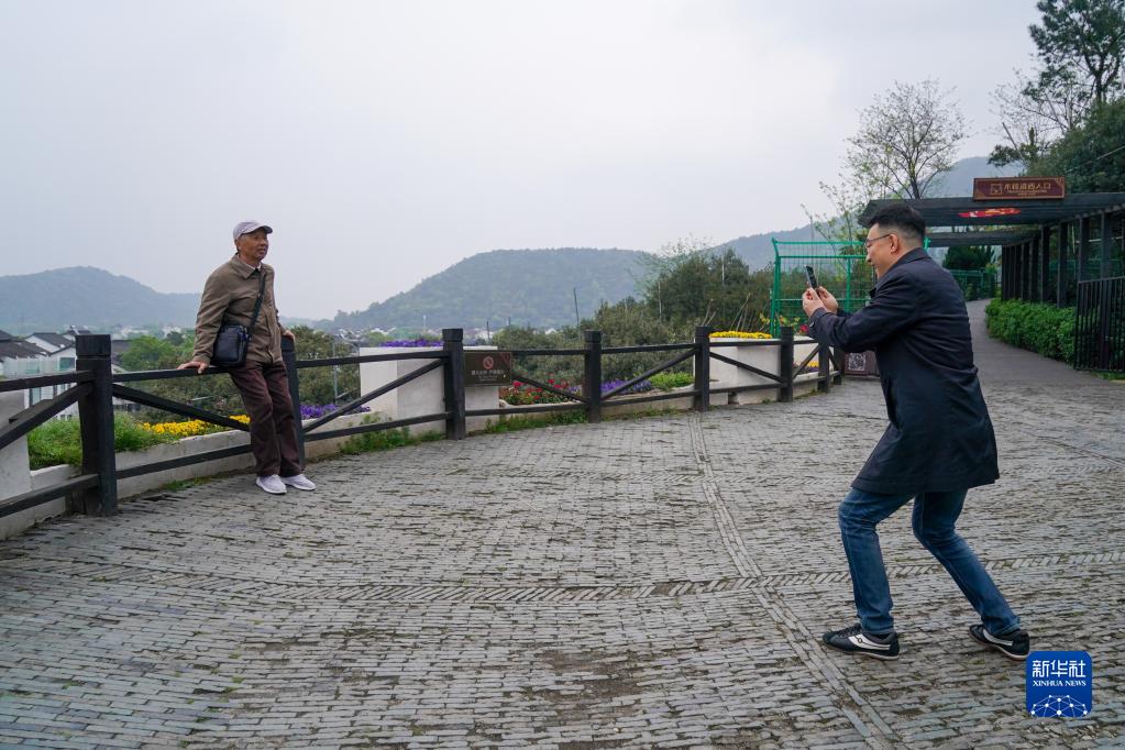 4月6日,彭銳(右)在樹(shù)山村觀(guān)景平臺為一位游客拍照留念。 新華社記者 李博 攝