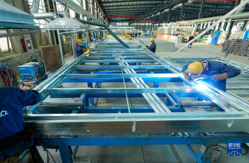 4月11日,河北省玉田縣一家裝配式建筑制造企業(yè)的工人在生產(chǎn)線(xiàn)上進(jìn)行焊接作業(yè)。
