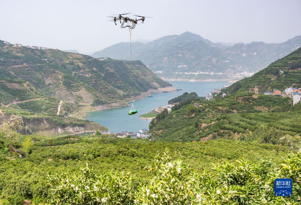 4月11日,秭歸縣郭家壩鎮擂鼓臺村村民使用無(wú)人機往臍橙園轉運化肥。
