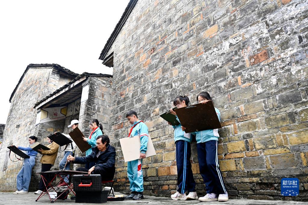 4月10日,在柳城縣古砦仫佬族鄉大戶(hù)村灘頭屯,幾名學(xué)生跟隨老師在民居旁寫(xiě)生。