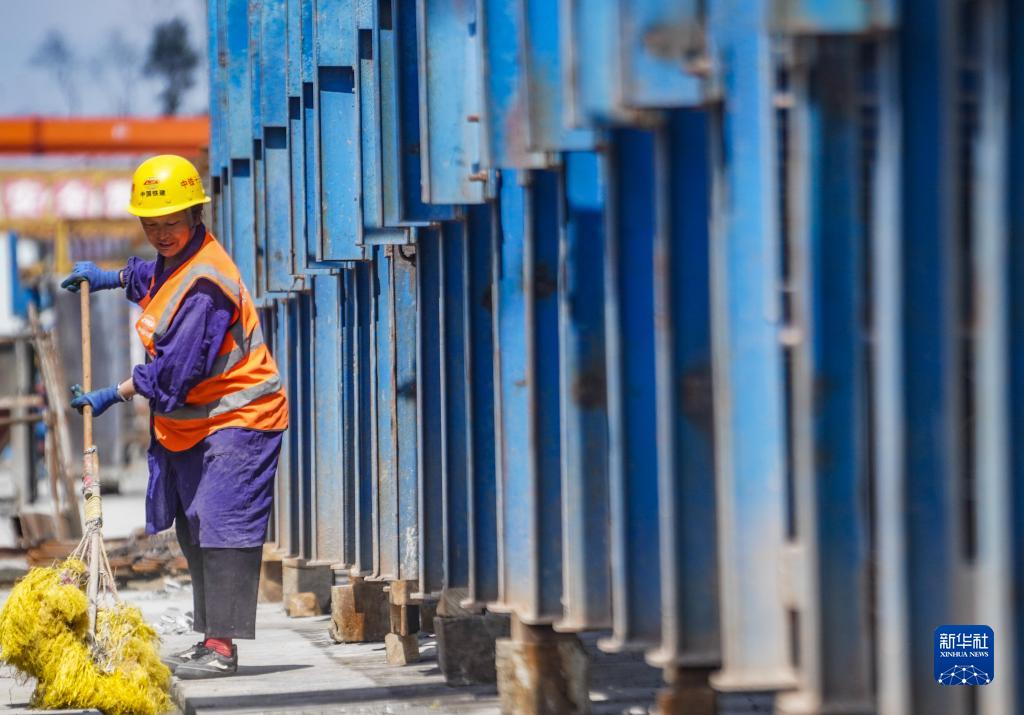 梁開(kāi)高速梁場(chǎng)制梁區保潔員沈亞珍在工地打掃衛生(2023年3月20日攝)。