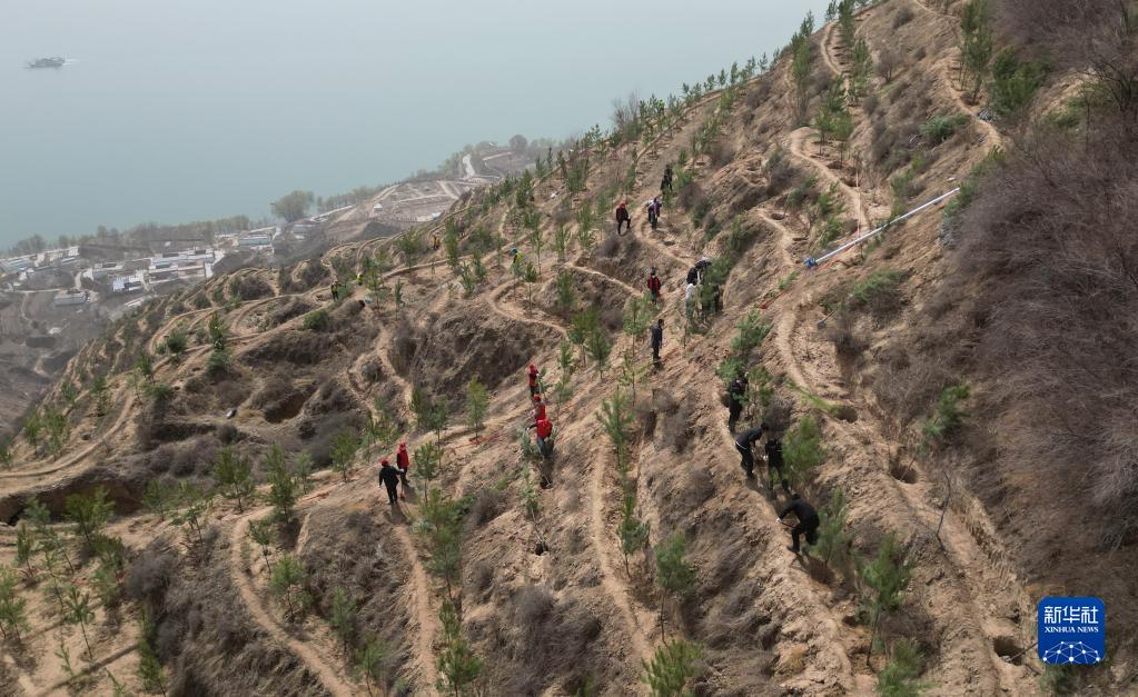 4月11日,人們在黃河劉家峽水庫岸邊植樹(shù)。