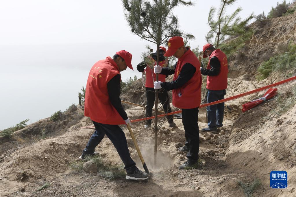 4月11日,人們在黃河劉家峽水庫岸邊植樹(shù)。