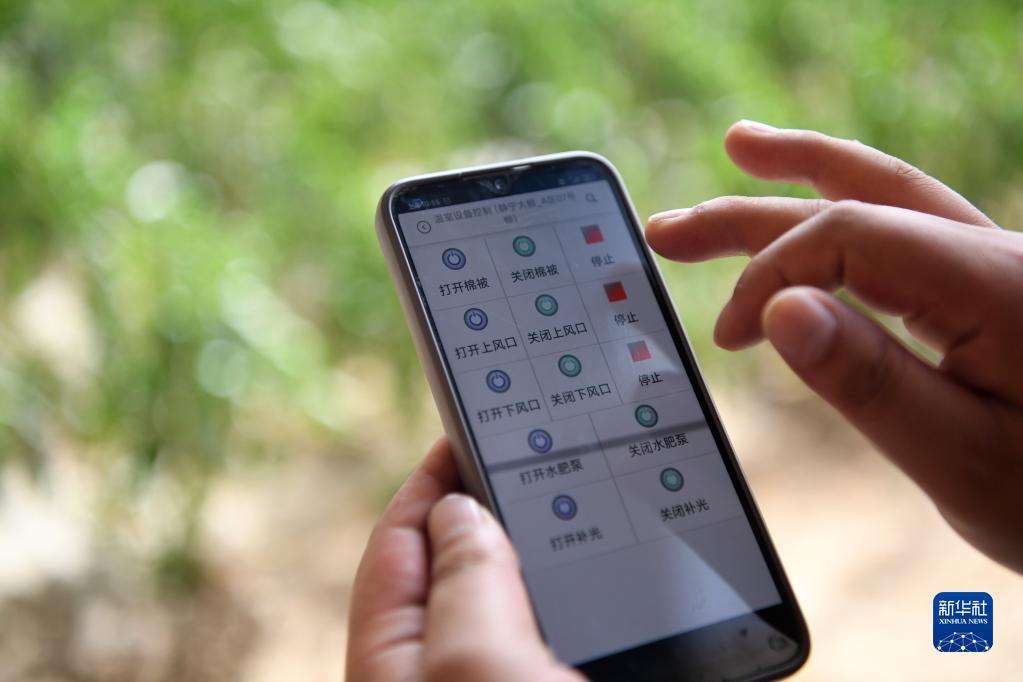 4月11日,在靜寧縣界石鋪鎮李堡村現代設施農業(yè)產(chǎn)業(yè)園,技術(shù)人員李志強用手機控制日光溫室設備。