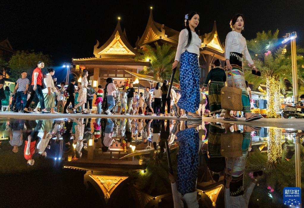 華燈初上,位于云南省德宏傣族景頗族自治州芒市的傣族古鎮逐漸熱鬧起來(lái)。作為2022年國家文化和旅游部確定的第二批國家級夜間文化和旅游消費集聚區之一,這里極具特色的少數民族建筑、服飾、舞蹈、美食吸引著(zhù)人們流連忘返。