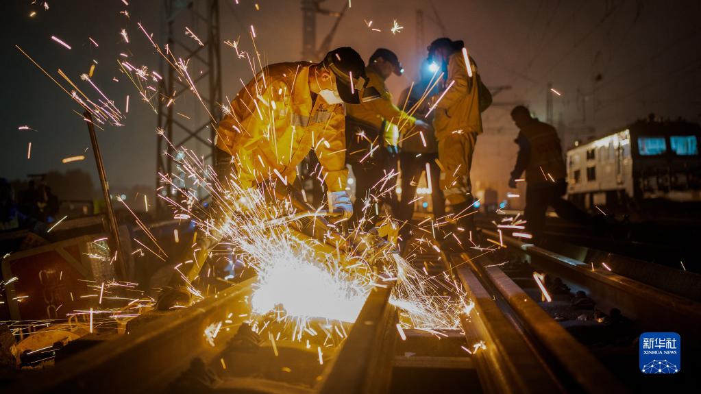 4月12日,在廣西欽州港站,工人在切割舊軌換新軌。