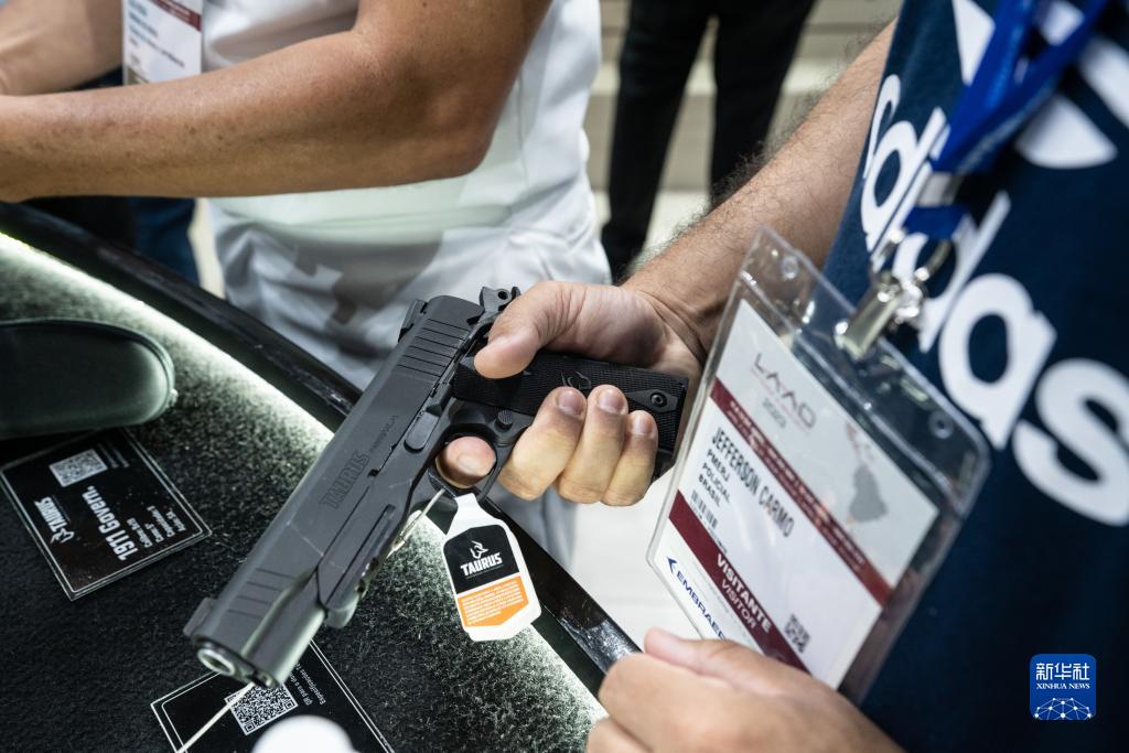 4月11日,在巴西里約熱內盧,參觀(guān)者在巴西防務(wù)展上體驗一款手槍。