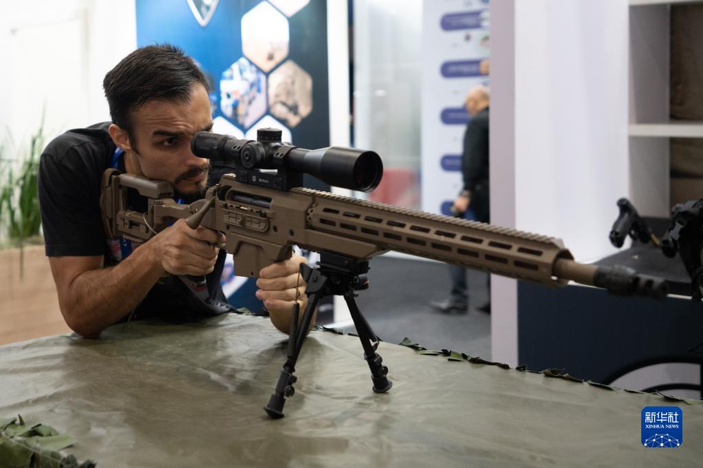 4月11日,在巴西里約熱內盧,一名男子在巴西防務(wù)展上體驗一款步槍。