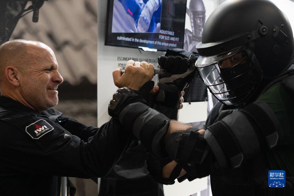 4月11日,在巴西里約熱內盧,工作人員在巴西防務(wù)展上展示一款防刺服。