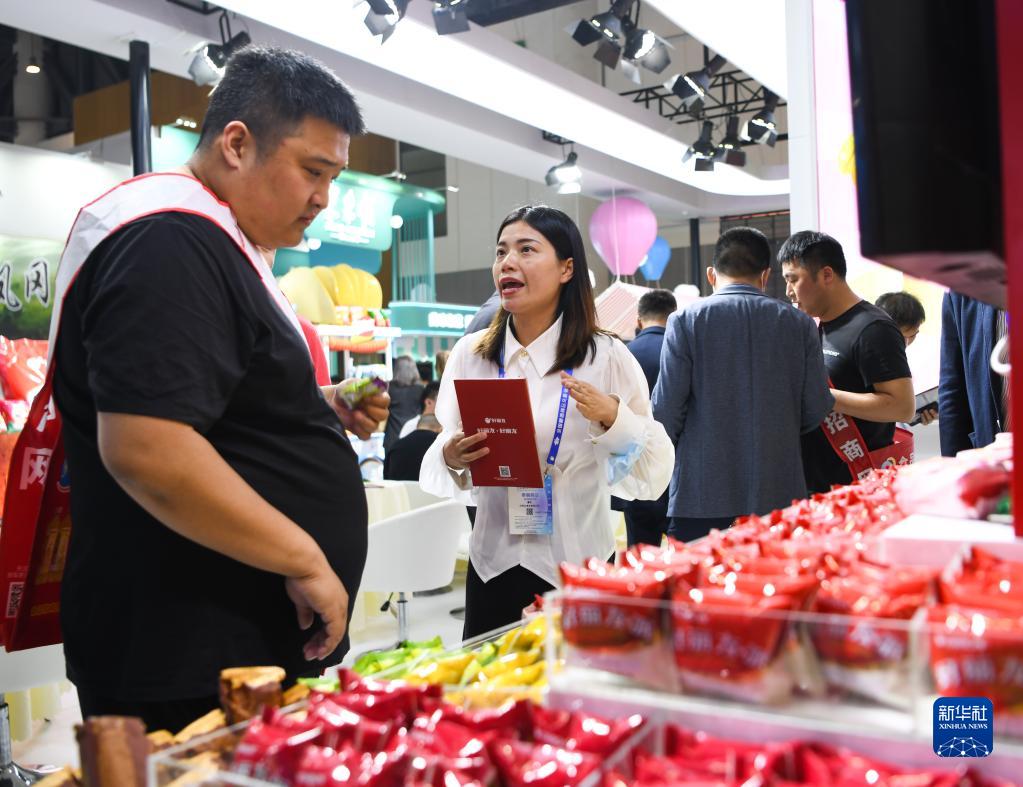 4月12日,在四川省成都市中國西部國際博覽城,參展商(左二)在向客商介紹產(chǎn)品。