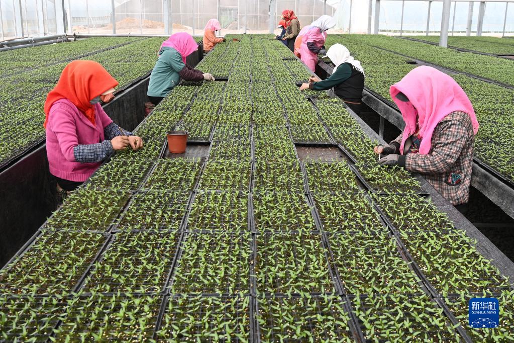 在張掖市甘州區黨寨鎮陳寨村玻璃智能溫室內,農民們進(jìn)行間苗作業(yè)(4月10日攝)。