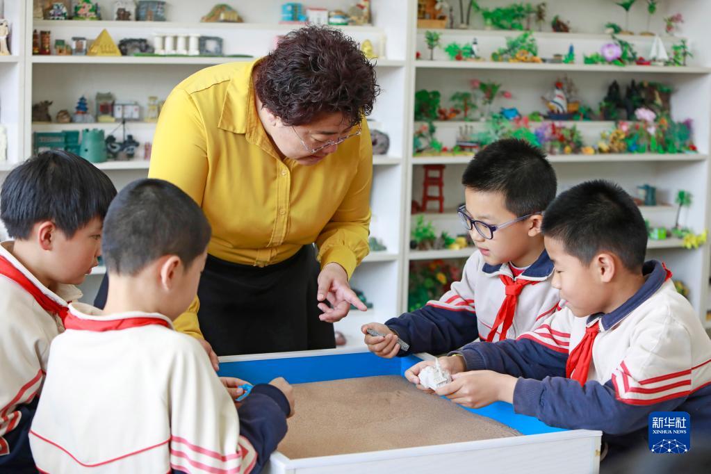 4月12日,大連市西崗區工人村小學(xué)的心理教師在心理輔導室陪學(xué)生一起擺放沙盤(pán)。