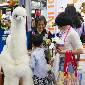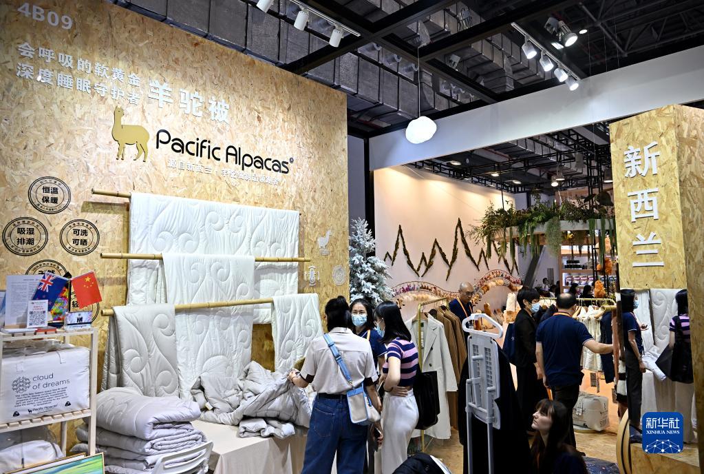 4月12日,參觀(guān)者在消博會(huì )新西蘭羊駝絨制品公司Pacific Alpacas的展臺內了解羊駝被。