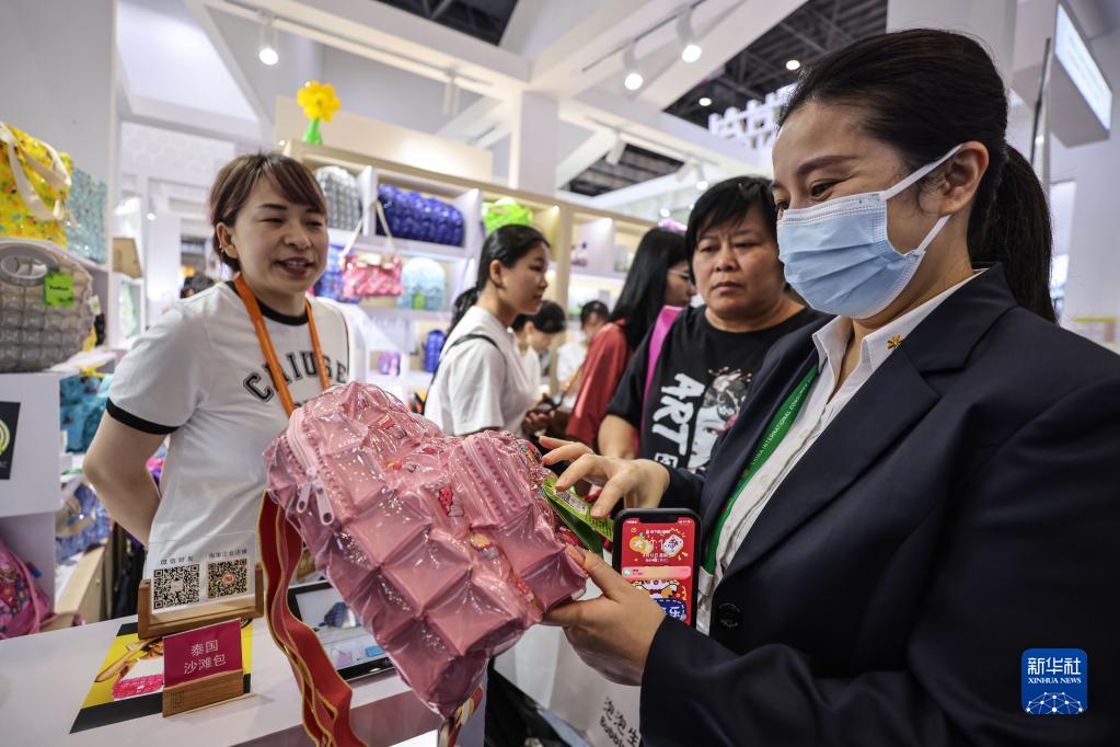4月12日,消博會(huì )泰國館的參展商向觀(guān)眾介紹泰國沙灘包。