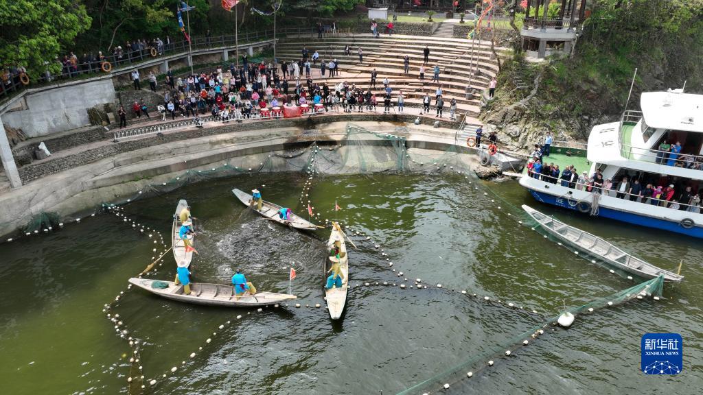 4月12日,在安徽省黃山市歙縣的新安江山水畫(huà)廊景區,游客欣賞傳統民俗表演“九姓捕魚(yú)”(無(wú)人機照片)。