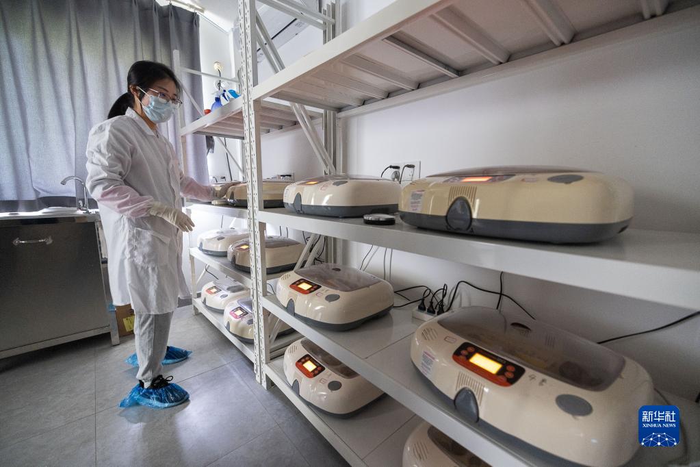 4月12日,在下渚湖朱鹮繁育研究基地人工孵化室,工作人員檢查朱鹮孵化情況。