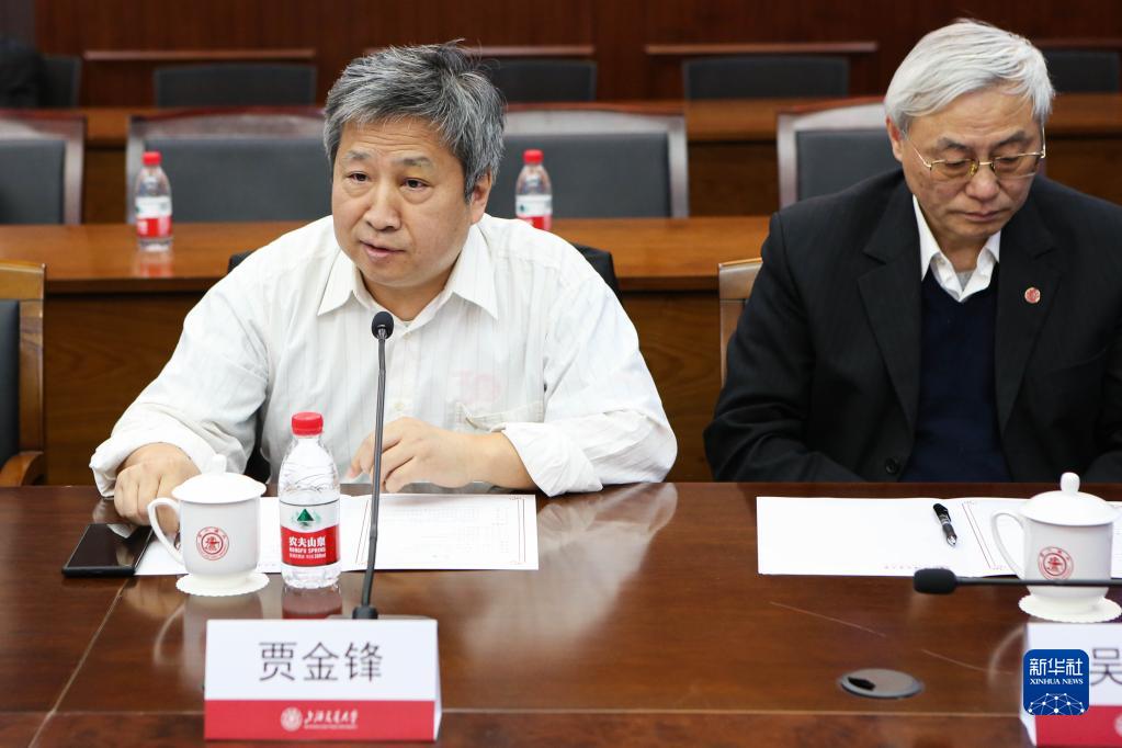 4月12日,中國科學(xué)院院士、上海交通大學(xué)物理與天文學(xué)院教授賈金鋒(左一)介紹“實(shí)驗證實(shí)超導態(tài)‘分段費米面’”成果整體情況。