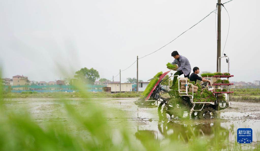 4月10日,黃從明(左)在插秧機上和同事一起插秧。