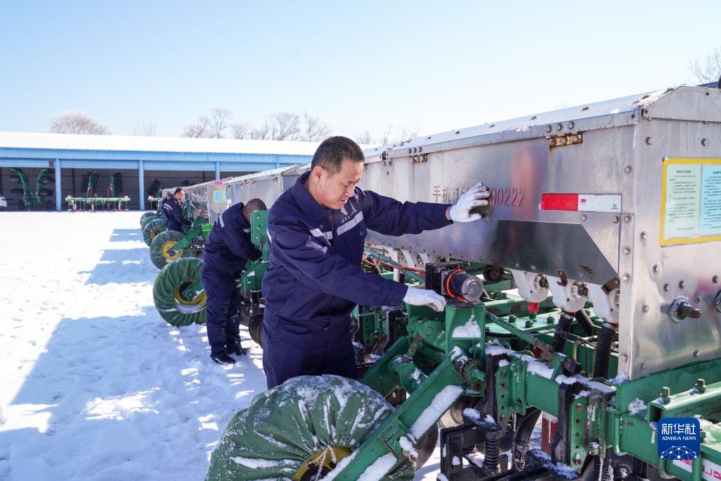 在建設農場(chǎng)有限公司第四管理區農機中心,許志國(右)在檢修農機具(3月16日攝)。