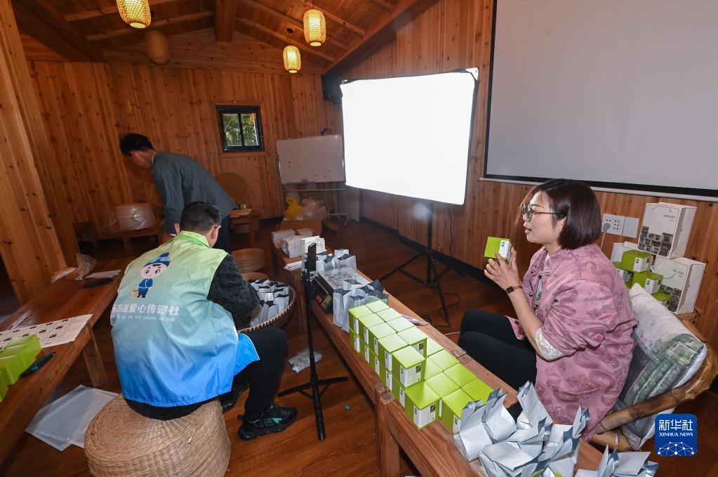 4月13日,在諸暨市東白湖鎮斯宅村“裕昌號恒諾甄選共富工坊”內,志愿者(右一)在直播介紹斯宅石筧茶。