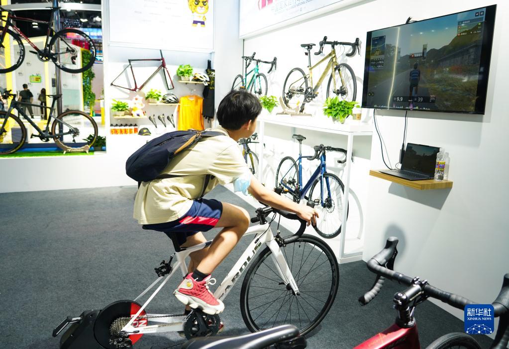 4月13日,參觀(guān)者在體驗國產(chǎn)智能功率騎行臺。