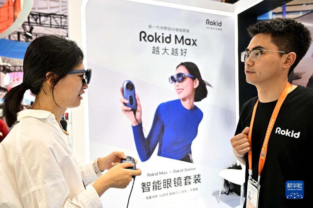 4月13日,一名參觀(guān)者在浙江展臺體驗一款智能眼鏡。
