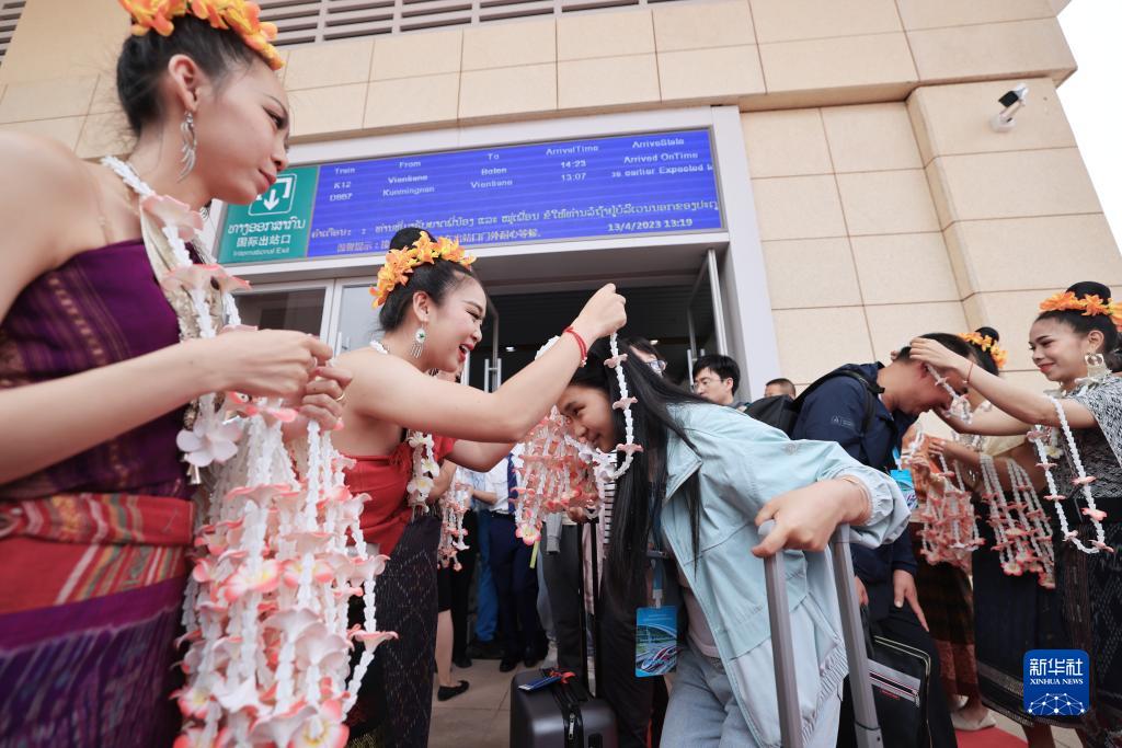 4月13日,在中老鐵路老撾磨丁站,工作人員歡迎乘坐D887次國際旅客列車(chē)的旅客抵達磨丁。