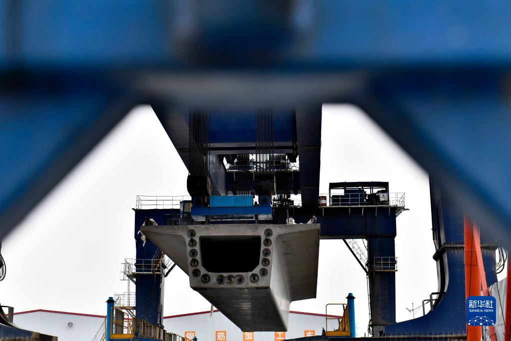 4月13日,在濟鄭高鐵中鐵十局濟南西制梁場(chǎng),提梁機在轉運箱梁。