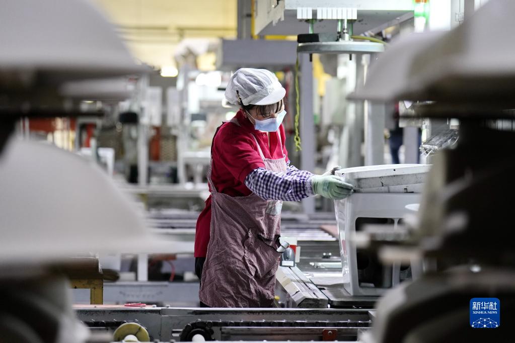 4月13日,唐山市一家衛浴出口企業(yè)的工人在生產(chǎn)線(xiàn)上工作。